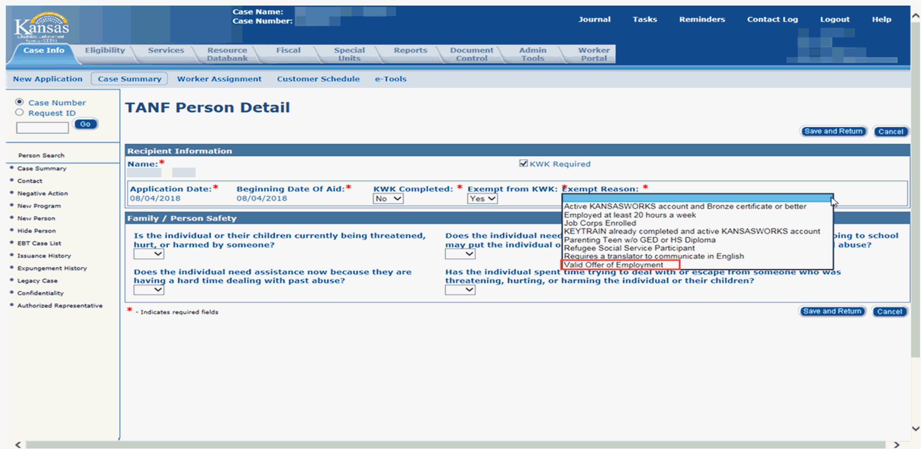 The Administration for Children and Families (ACF) requires states to report denial reasons for the TANF program accurately. With KEES, we are seeing an increase in denial reasons that fall within the ‘Other’ category. For example, Not Eligible – Other Reasons or Not Initially Eligible. This can occur when a TANF application is obviously ineligible and not all the eligibility steps are completed in KEES--resulting in a Negative Action of Not Eligible – Other Reasons or an inaccurate Status Reason from rules because not all data collection has been entered prior to running EDBC. We’ve received feedback that the KWK indicator in KEES is one data collection piece that prevents staff from being able to use Rules to deny a case because the KWK isn’t always completed when a denial is obvious, but KEES requires the field when running EDBC. As a workaround, staff should indicate the client as Exempt from completing the KWK with an Exempt Reason of Valid Offer of Employment.
