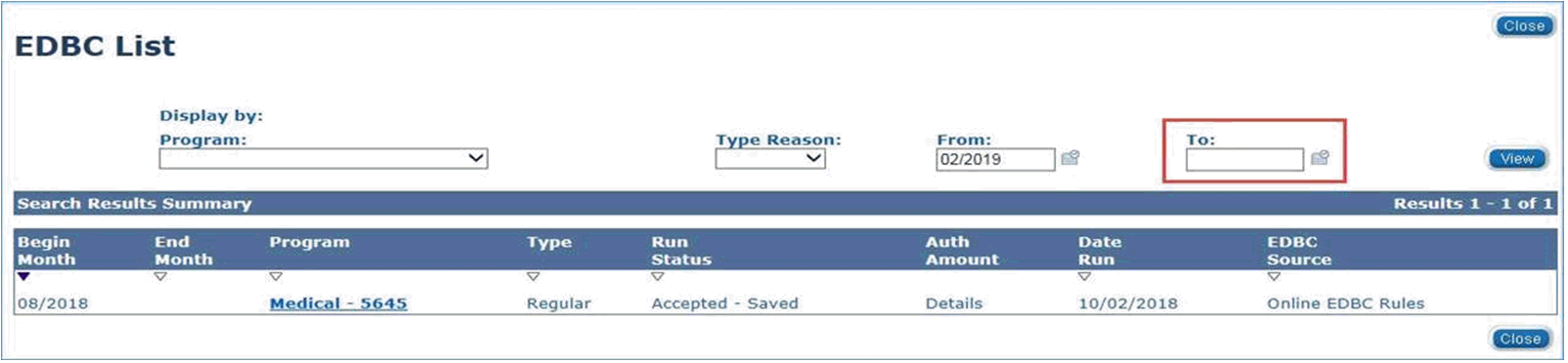 When viewing EDBC Results on the EDBC List page, the To: field should default to the EDBC come-up month. However, this field is not in sync with the EDBC come- up month changes implemented with the January release. In order to make sure the most recent EDBC displays on the EDBC List page, staff should change or remove the date in the To: field prior to clicking the View button until this is fixed.